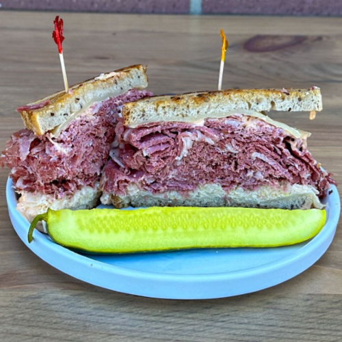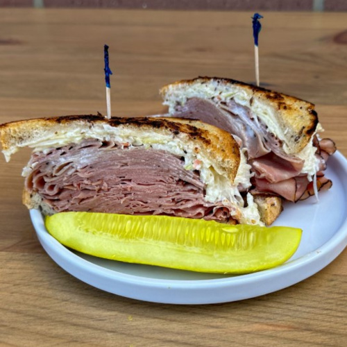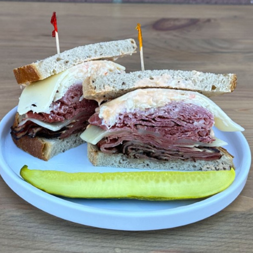 Hot Corned Beef, Pastrami, Swiss Cheese, Coleslaw, and Thousand Island Dressing, Served Grilled on Rye