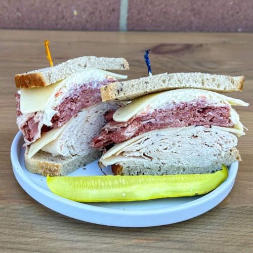Hot Corned Beef, Turkey, Swiss Cheese, Coleslaw, and Mustard Served on Rye