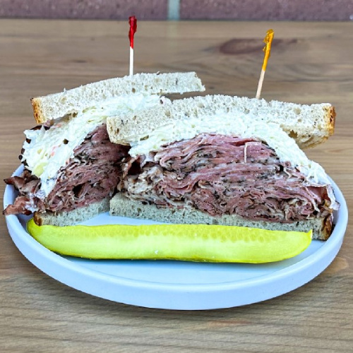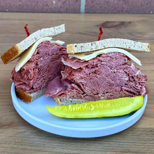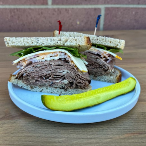 Beef Brisket, Muenster Cheese, Lettuce, and Red Onion on Rye