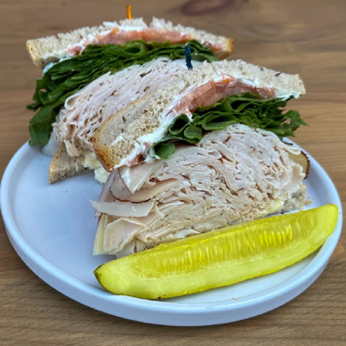Turkey, Smoked Turkey Breast, Honey Turkey Breast, or Cajun Turkey Breast, Provolone Cheese, Lettuce, Tomatoes, Red Onion, and Mayonnaise on Rye